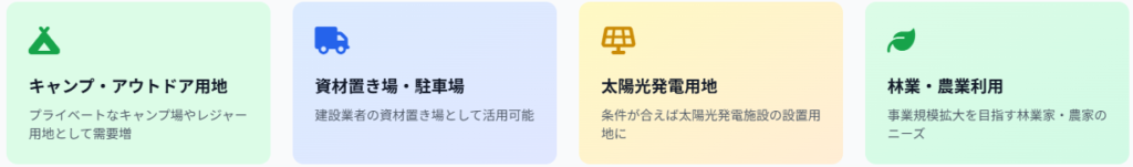 - キャンプ・アウトドア用地: 近年のアウトドアブームで、プライベートなキャンプ場やレジャー用地としての需要が高まっています。