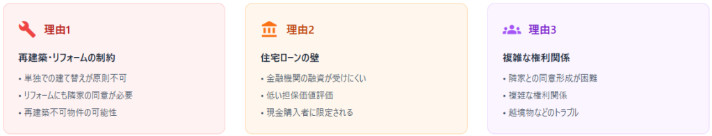 長屋・テラスハウスの最大の特徴は、複数の住戸が壁を共有している点です。これが売却時の大きな足かせとなります。