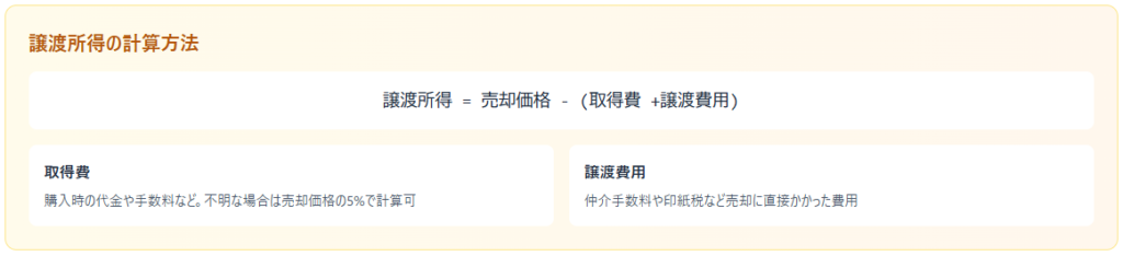 譲渡所得 = 売却価格 – (取得費 + 譲渡費用)