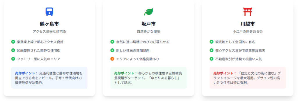 | 鶴ヶ島市 | 東武東上線が通り、都心へのアクセスが良好。区画整理された閑静な住宅街が多く、ファミリー層に人気。近年、土地価格は比較的安定しているが、物件の供給数によっては価格変動も見られる。大手不動産会社の査定対応も活発。 | 交通の利便性と静かな住環境を両立できる点をアピール。子育て世代を意識し、周辺の公園や学校、商業施設の情報を充実させることが有効。 |