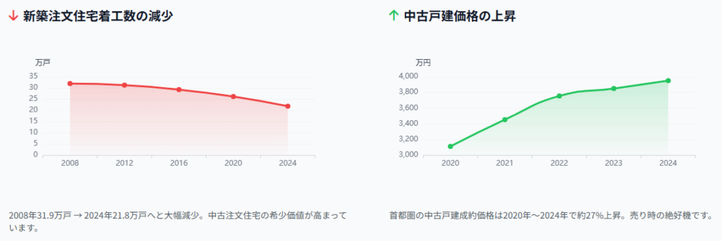 (注)上記は2025年7月時点の一般的な市場動向です。個別の物件価格は、築年数、立地、状態によって大きく変動します。正確な売却相場を知るためには、必ず専門家による査定が必要です。